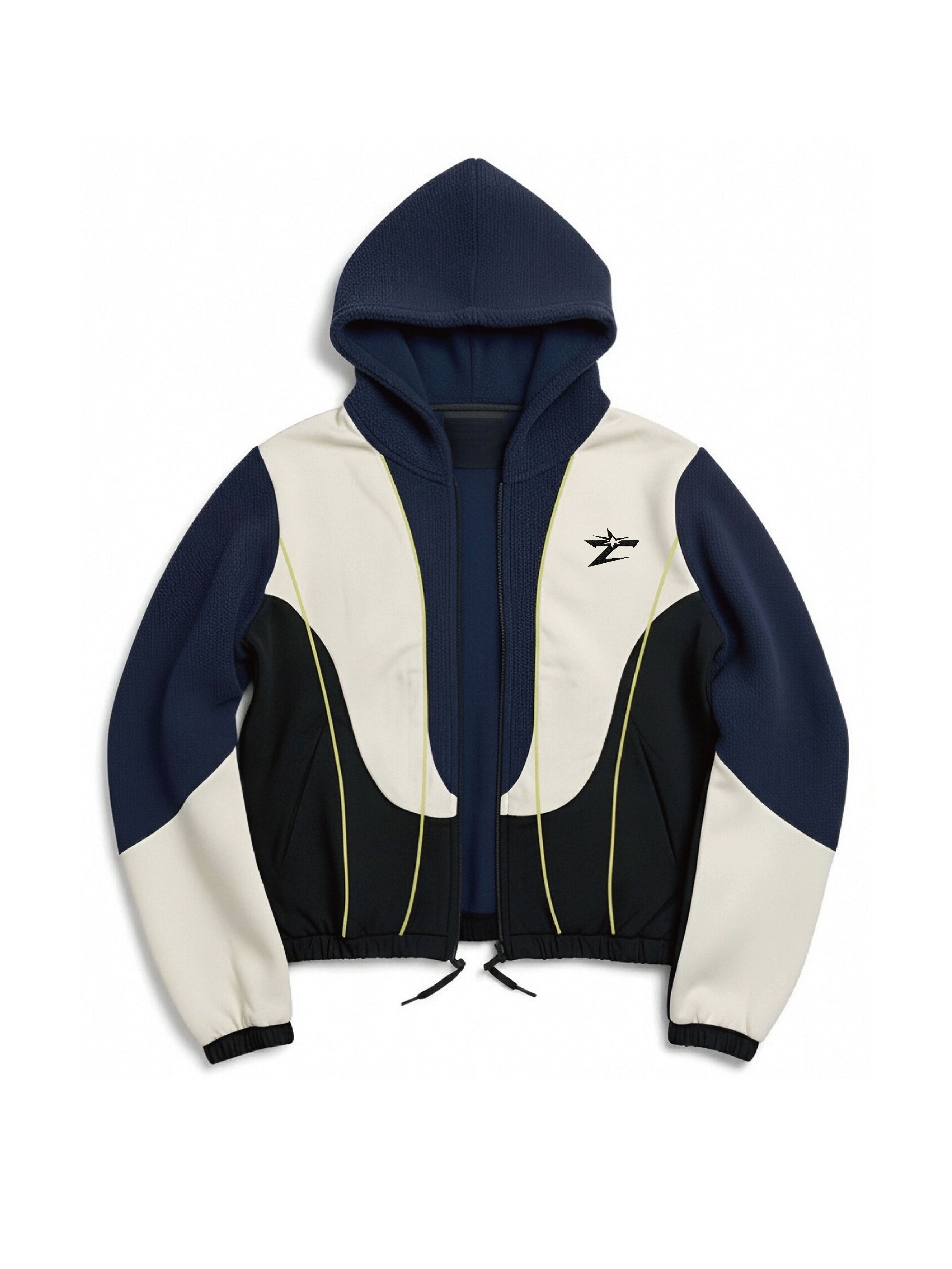 Navy & Cream Curved-Panel Contrast-Stitch Cropped Hoodie