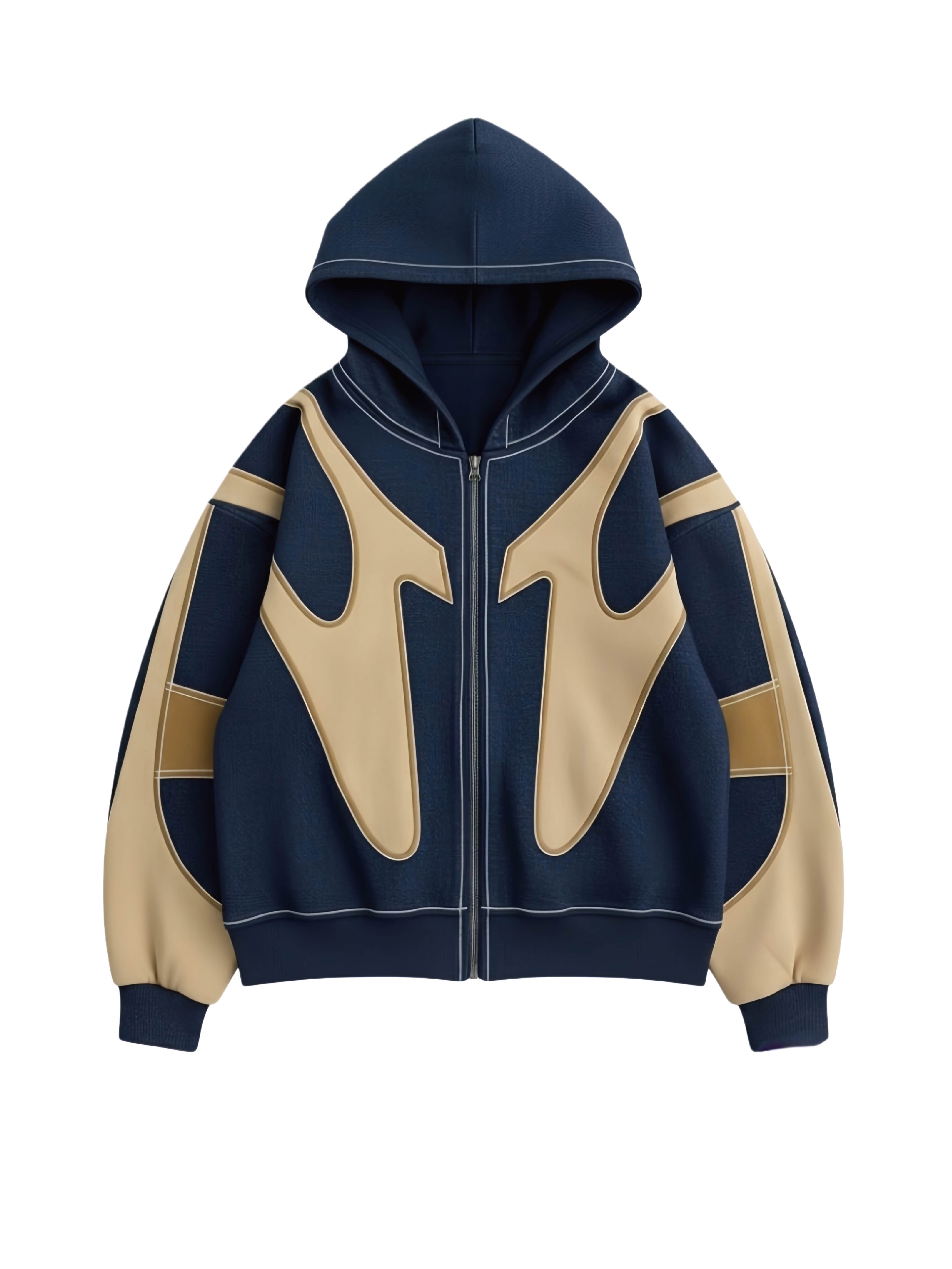 Navy & Khaki Flame-Panel Contrast-Stitch Full-Zip Oversized Hoodie