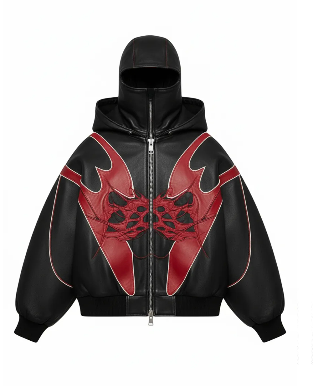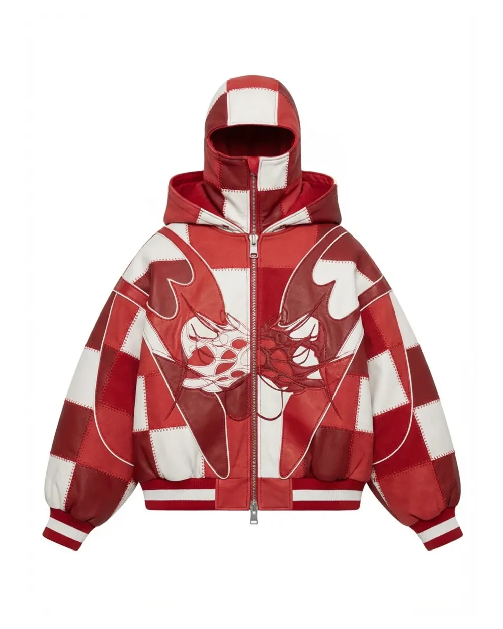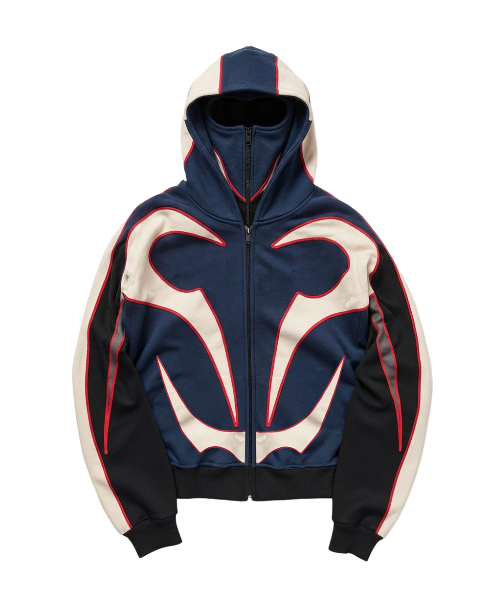 Mask-Attached Cross & Geometric-Line Full-Zip Hoodie-Red