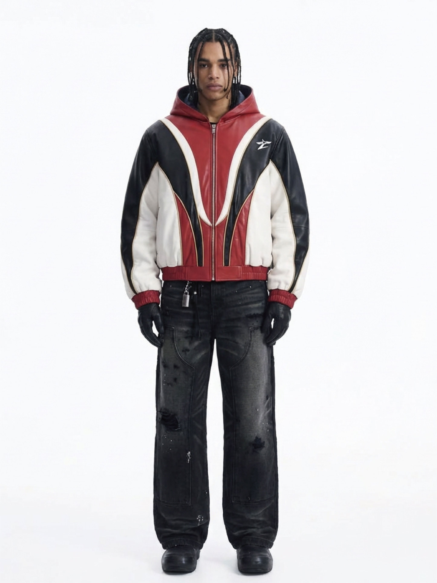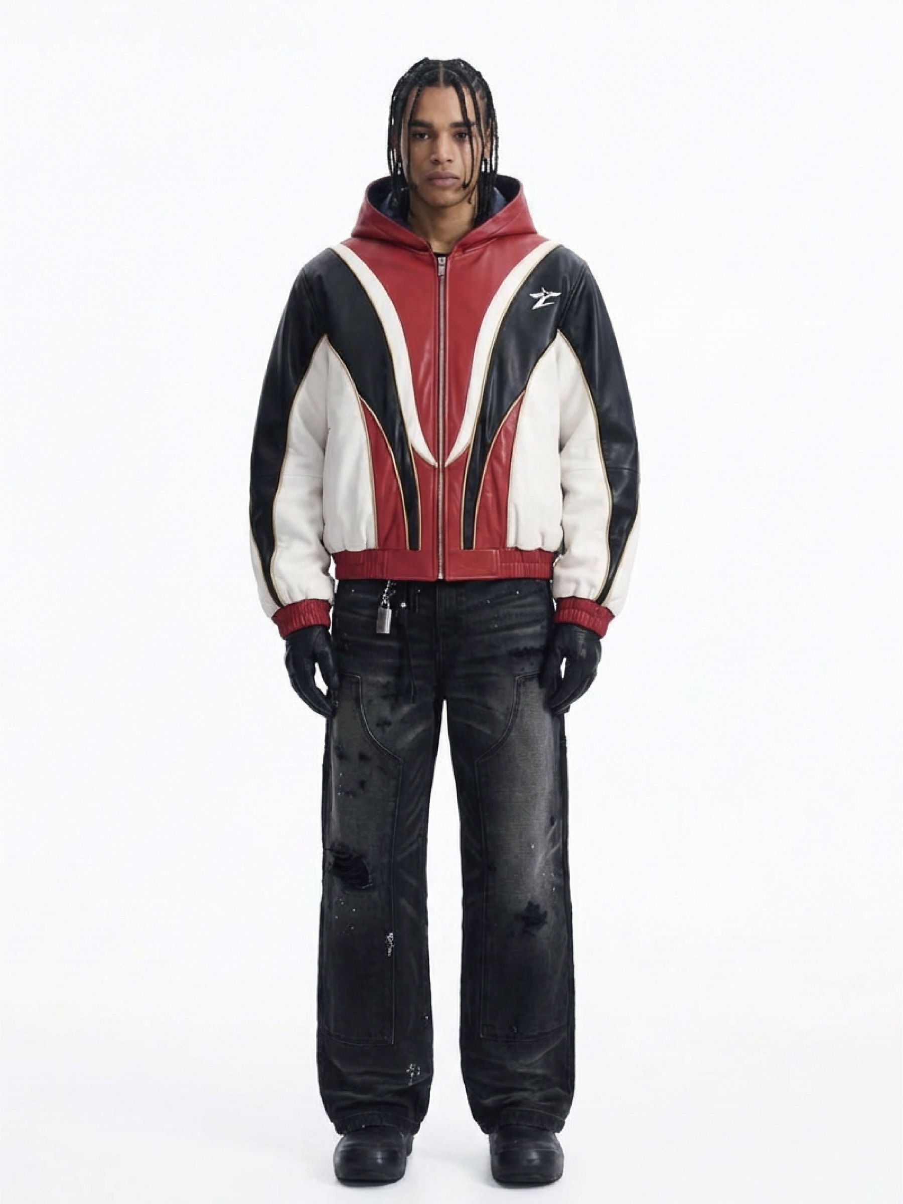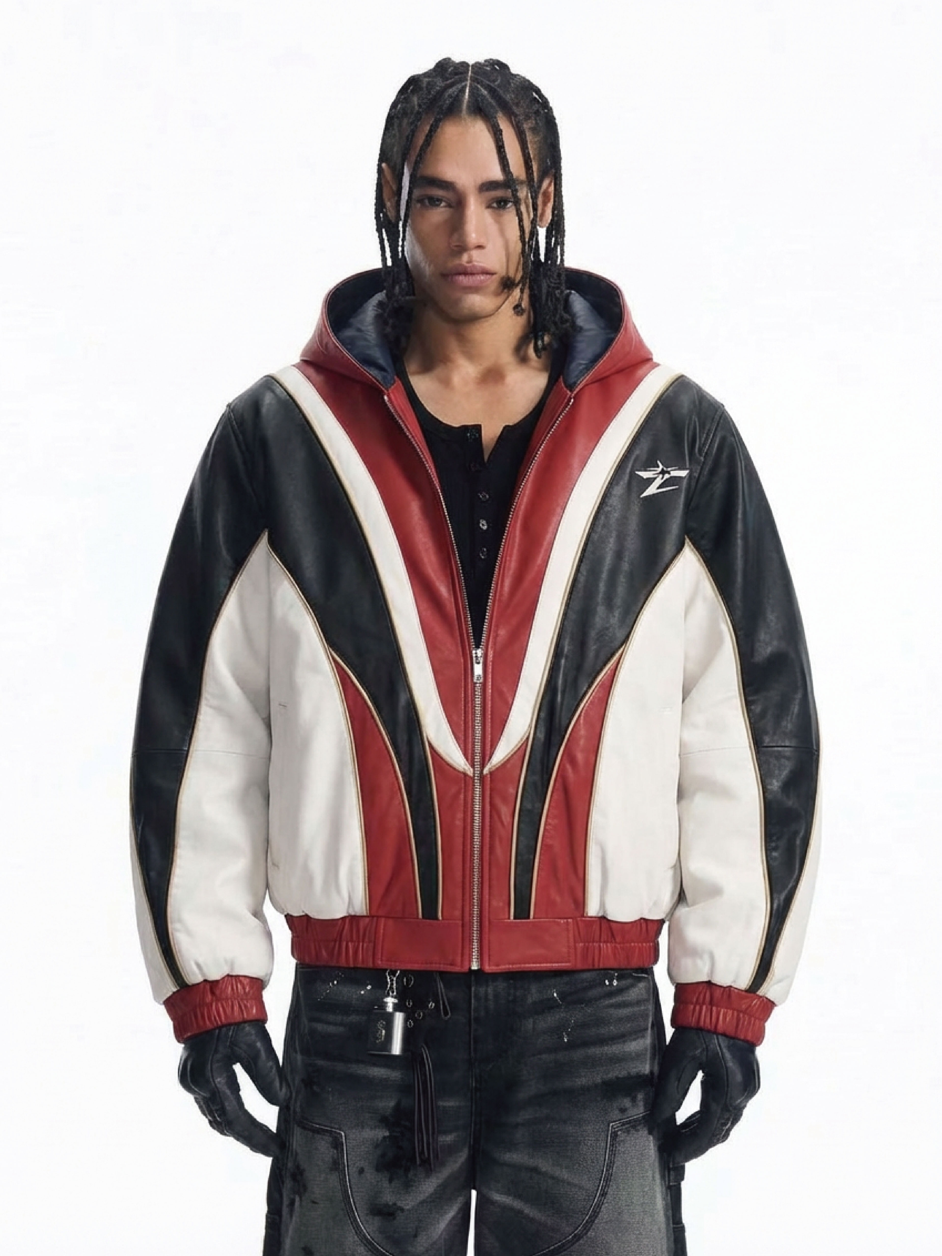 This full-zip hooded jacket is crafted from smooth, durable leather, featuring a striking three-tone color-block design with dynamic curved panels in red, black, and white. Accented with subtle gold contrast stitching and a compact Z-shaped emblem, it balances edgy, retro-inspired style with modern streetwear flair.
