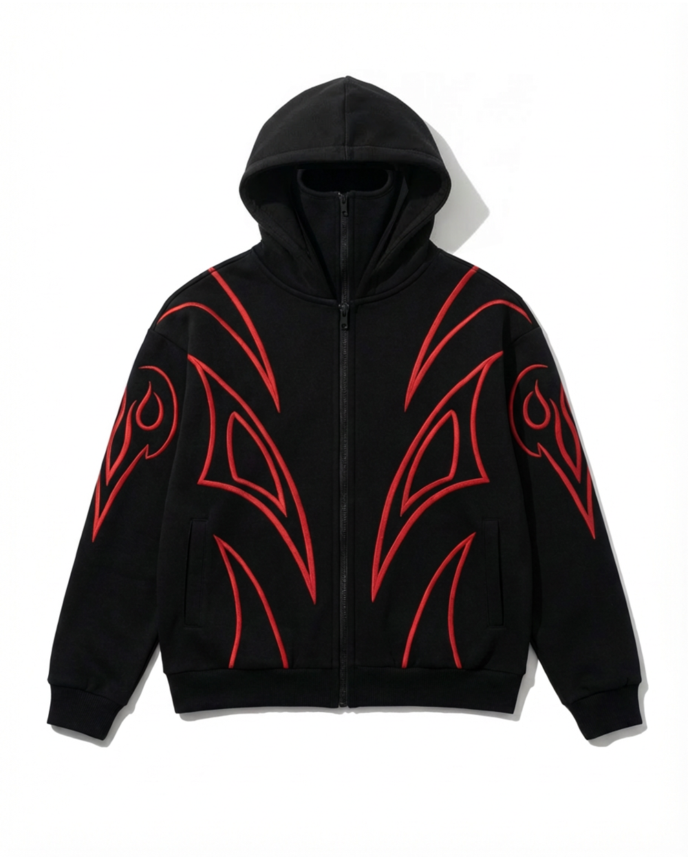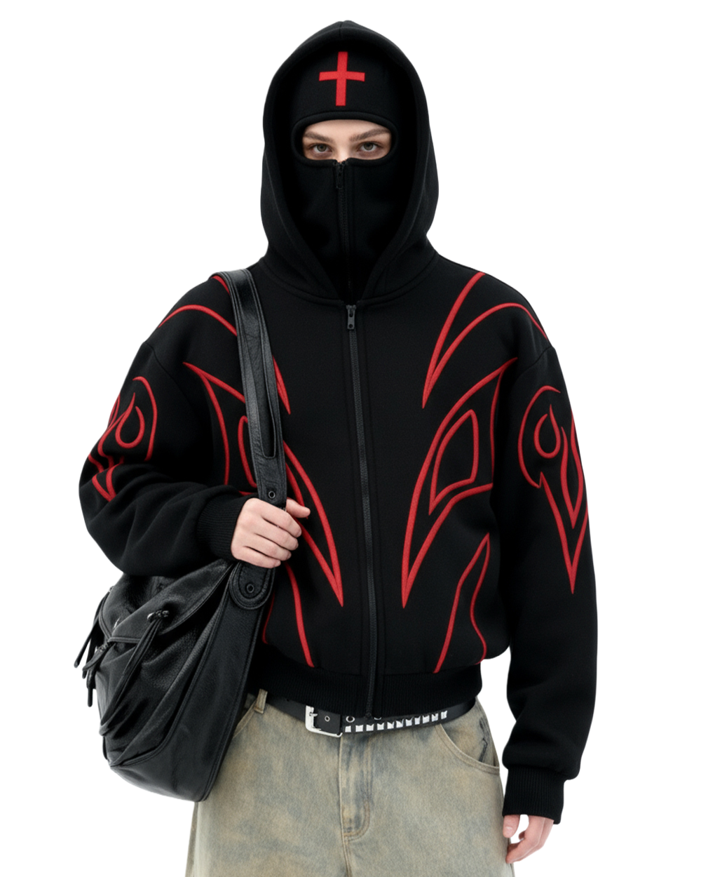 - Design Accents: Built-in hood-attached face mask; white cross embellishment (hood); bold white geometric line accents (body)