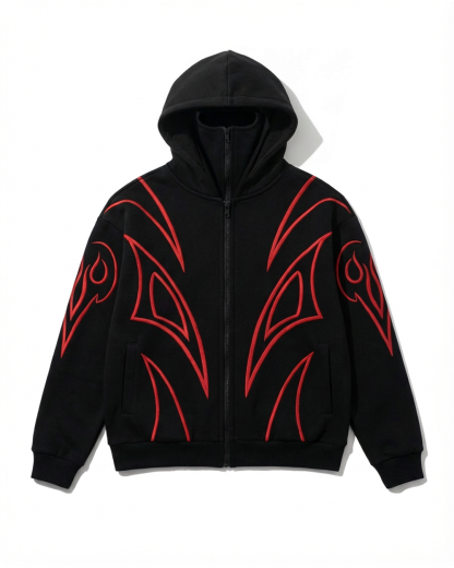 This full-zip hoodie leans into avant-garde street style, crafted from soft, warm knit fabric that ensures cozy all-day wear. Set against a deep navy base, it features distinctive design details: a white cross embellishment on the hood, bold white geometric line accents on the body, and a built-in face mask (seamlessly attached to the hood for optional coverage).