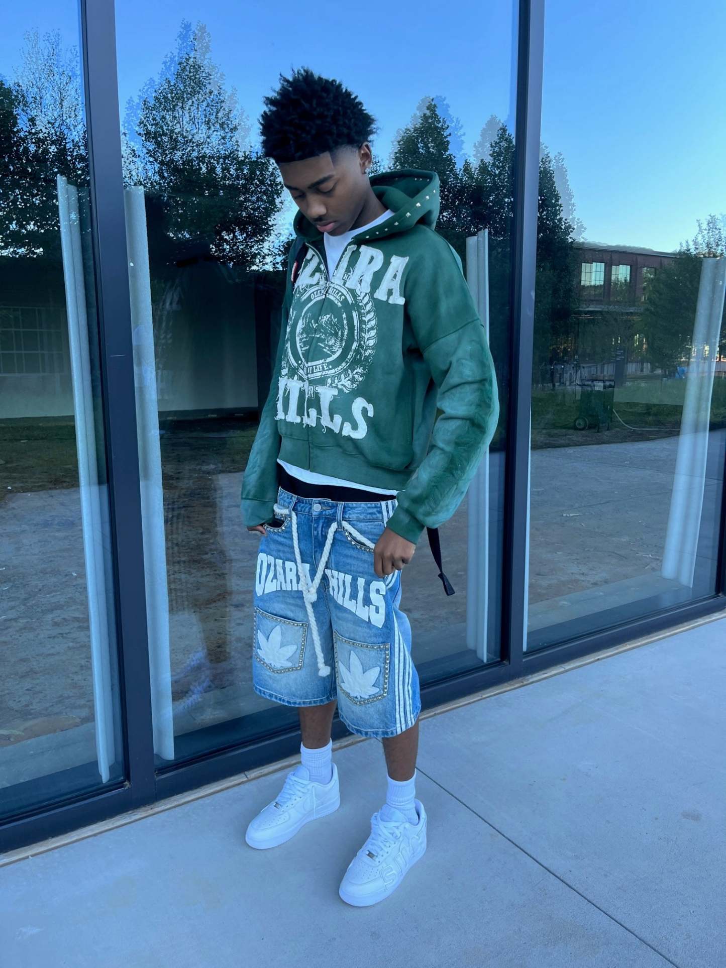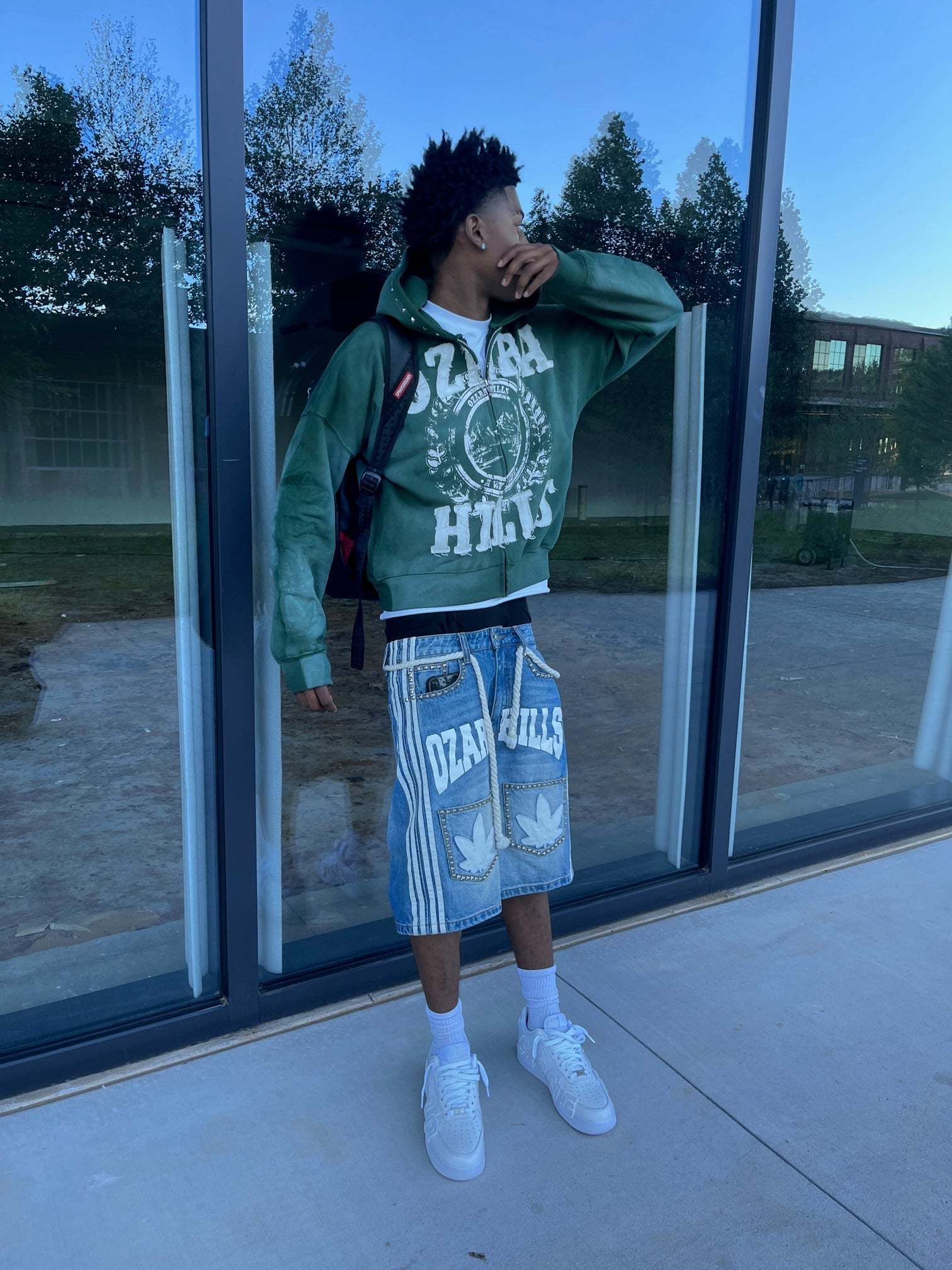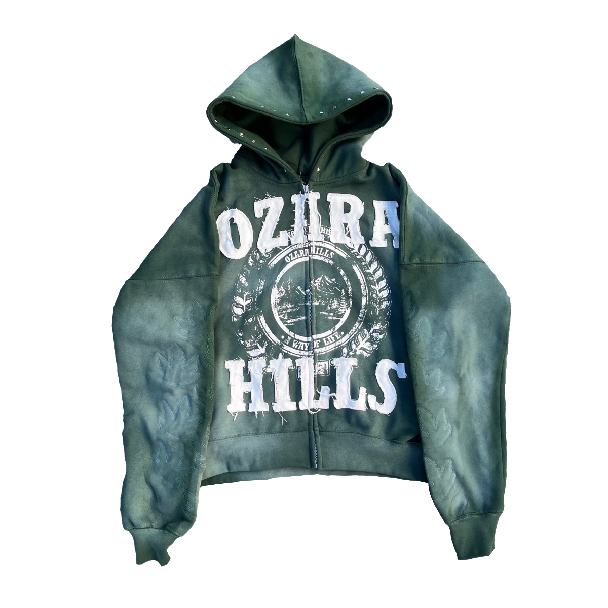: Embroidered sleeve leaves and distressed "Ozara Hills" graphic.