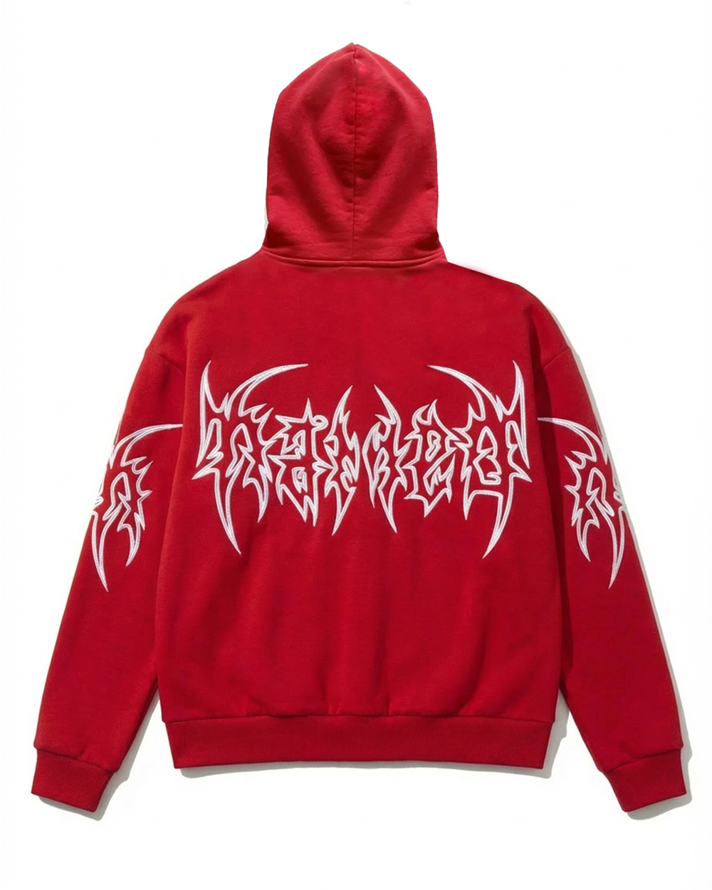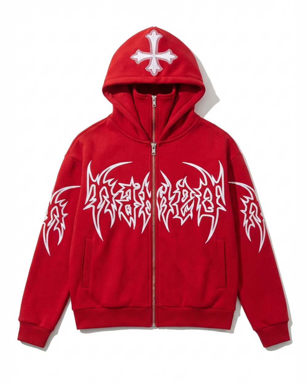 Red hooded jacket with stitched pattern