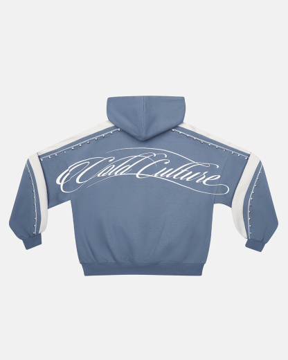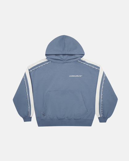 Blue colour with light grey stripes on the sleeves.