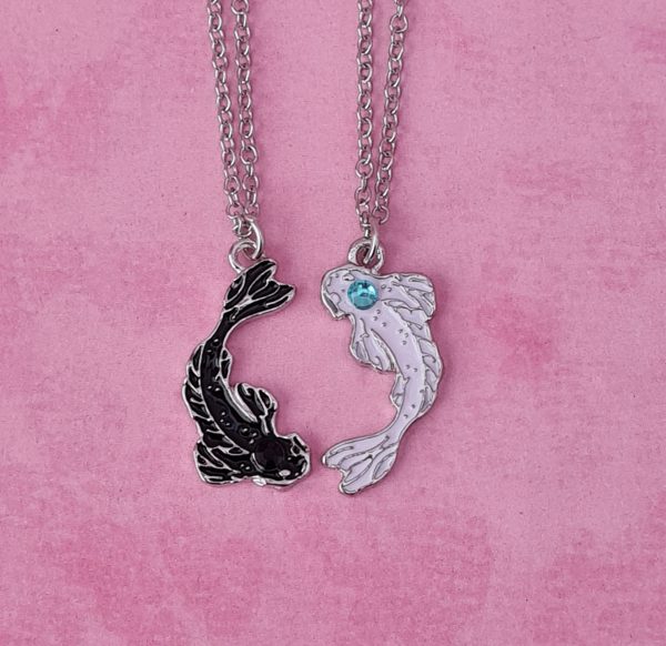 Necklace set of a black and white Koi fish pendant with rhinestone eyes (Blue for Gojo and Black for Geto)
