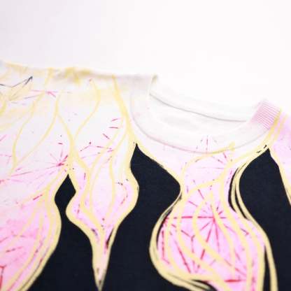 The fabric is made from jacquard knit and the highest quality 100% cotton yarns. This makes this T-Shirt super soft and breathable. The pattern on the whole T-Shirt is created with reactive print. Reactive print is one of the highest end printing methods as it fuses the colors into the fabric rather than just applying them to the surface. This creates vibrant colors that almost look like they were hand-painted by an artist. This printing method can also cost up to 10 times more than regular screen print. This is why you almost never see items under $150 using this method. However, it is our goal to create the high end merchandise you deserve and that will actually last you more than a few washes unlike many of the $35 out there that you can throw away after 2 washes. So we won't opt for anything less than the best for you guys! We want to make each item the best it can possibly be while keeping the prices as affordable as possible. This item is a reflection of this mission and we hope it bring you joy for a long time!